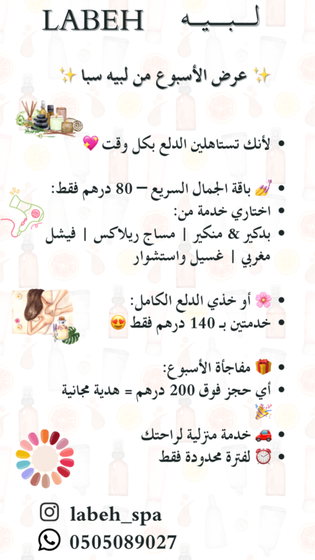 لـــبــيـه هـــوم ســـبا نؤمن أن الدلال والراحة حق لكل سيدةولذلك صممنا خدماتنا لتصل إليك أينما كنتِ، مع أعلى مستوى من الاهتمام بالتفاصيل احجزي موعدك من هنا قسم العروض والصور عرض الاسبوع March 26, 2026 قسم اراء وتعليقات الزباين Your review Your overall rating Select a Rating5 Stars4 Stars3 Stars2 Stars1 Star Title of your review Your name Submit Review حمام مغربي March 25, 2026 ام زايد